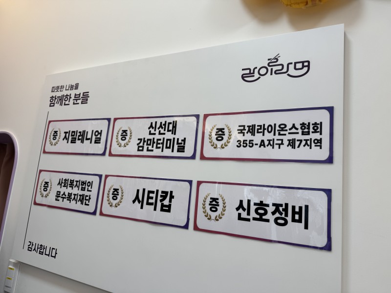 제7지역에서는 400만원 상당의 물품(라면기계 3대, 냉장고 등)을 후원하였으며, 개소식 당일 공동모금회를 통해 감사패를 수여 받았습니다.